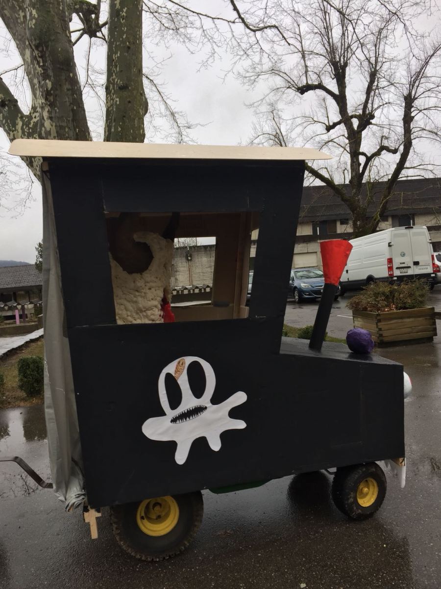 Notre éducateur Alain conduit le tracteur. Pas facile de ne pas écraser des gens avec ce gros masque sur la tête. (Rayan)