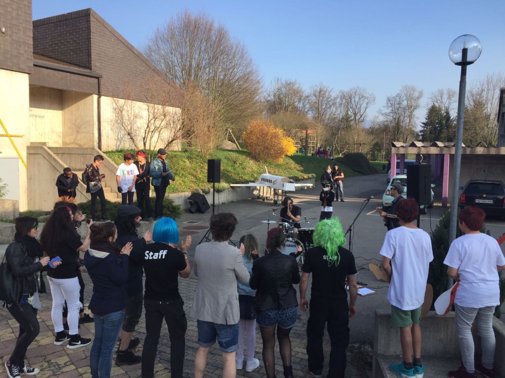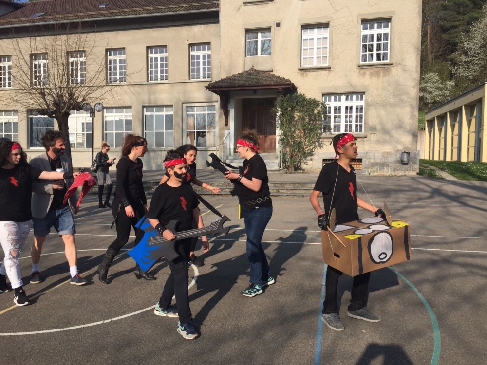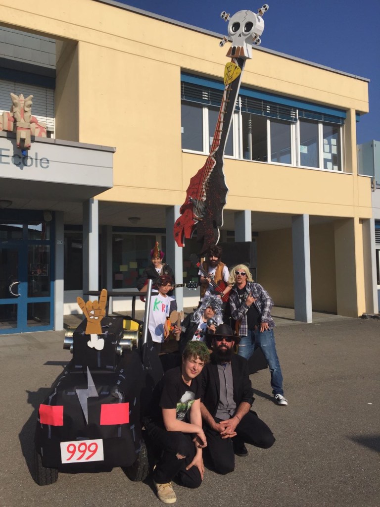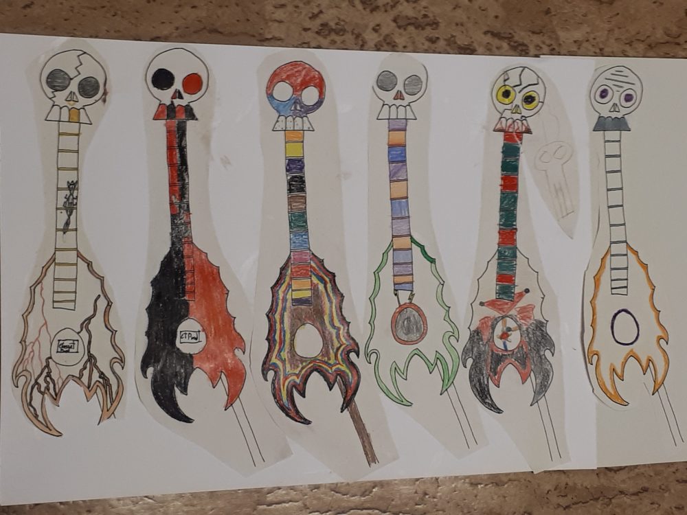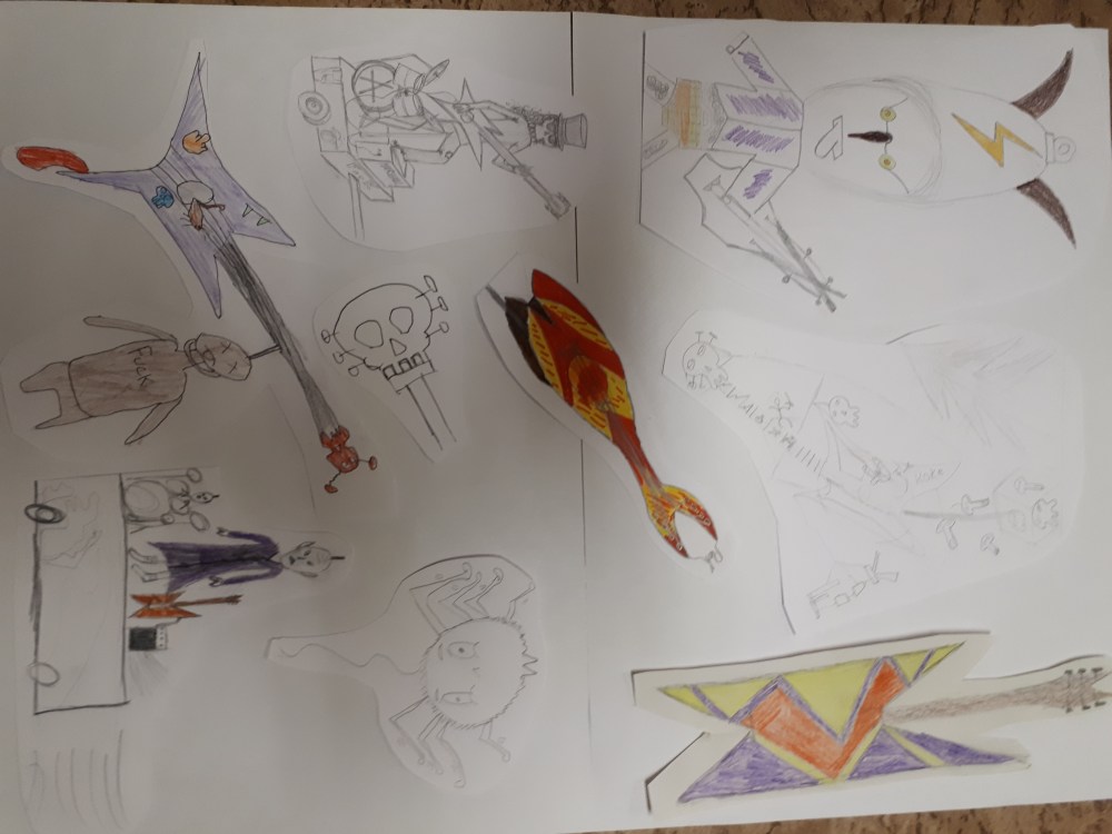 Toute la classe a choisi des idées pour le Rababou et proposé différents thèmes possibles. Le grand groupe des éducateurs a choisi le thème du rock’n’roll. Ensuite, les enfants de la Classe T ont réalisé divers projets de dessins dans lesquels nous retrouvions presque à chaque fois le motif d’une guitare.