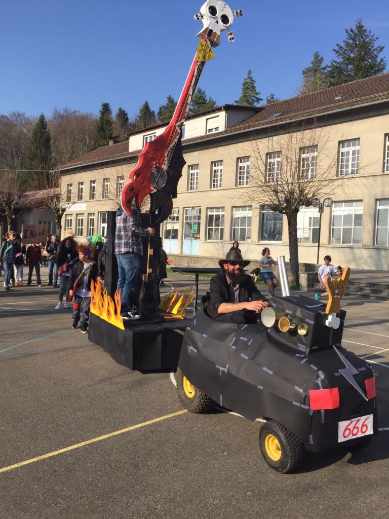 On a aussi décoré le char et le tracteur. On les a d’abord recouvert de papier noir. Pour le tracteur, nous voulions le transformer en vieille voiture américaine façon « dragster ». Nous avons fabriqué un faux moteur en carton et en boîtes de conserve. On a fait la plaque d’immatriculation 999, les ailerons et les pots d’échappement en carton. Après avoir fixé les faux amplificateurs sur le char nous l’avons encore décoré avec des flammes pour donner un effet plus Rock!!!